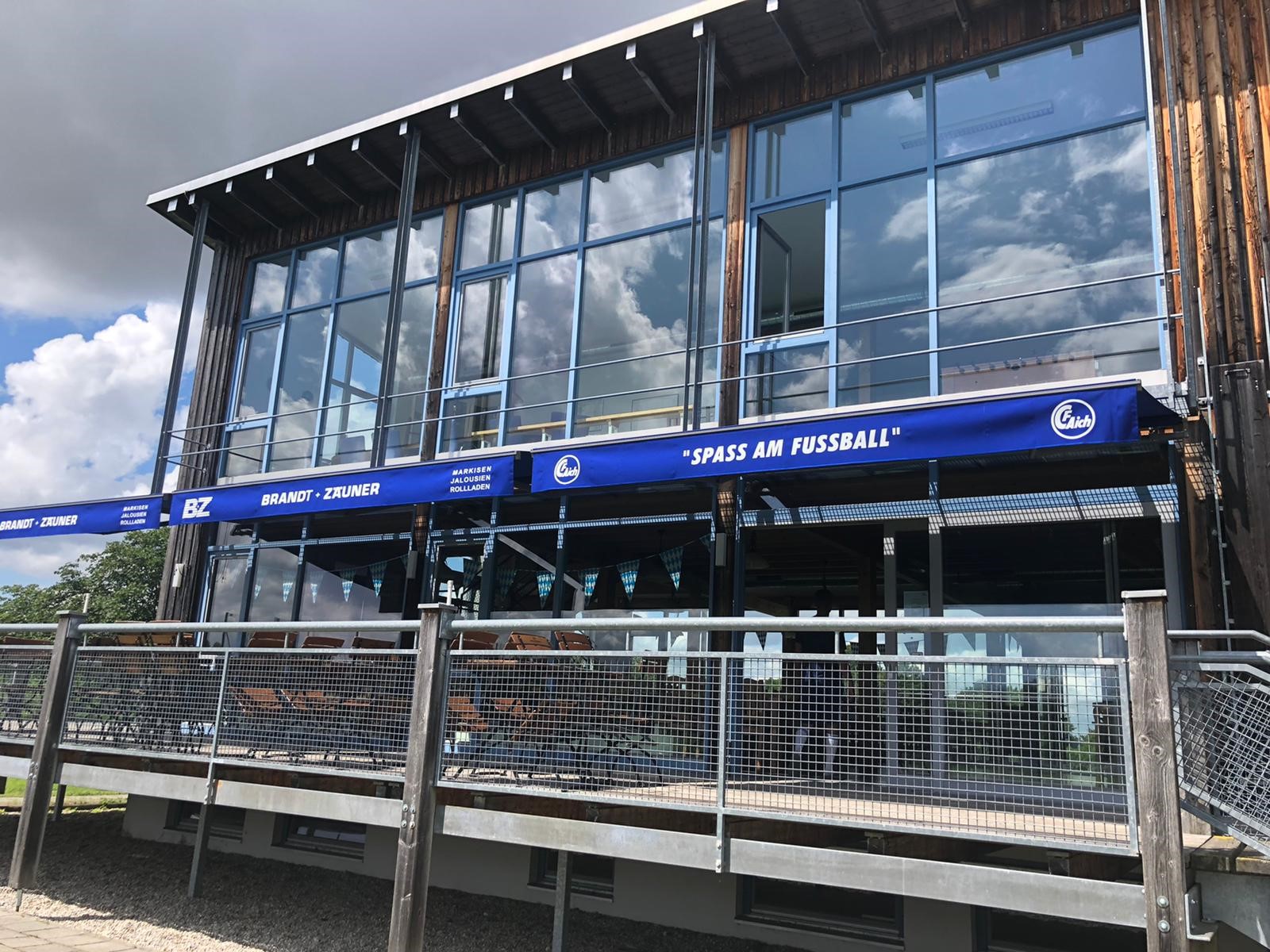 Die lange fußballfreie Zeit hat der FC Aich dafür genutzt, um mal so richtig aufzuräumen. Es wurde repariert, geputzt, erneuert, gestrichen und poliert. Alles erstrahlt im neuen Glanz… bis auf die Terrasse! Trotz Sonnenschein hingen die Markisen blass, fransig und traurig runter. Dank der Großzügigkeit der Firma Brandt & Zäuner konnten neue Markisen in Vereinsfarben angebracht werden. Nun steht einer guten Saison nichts mehr imWege. Die Zuschauer können jetzt gut beschattet ein kühles Getränk oder ein Eis genießen, während Sie spannende Spiele verfolgen und bejubeln.