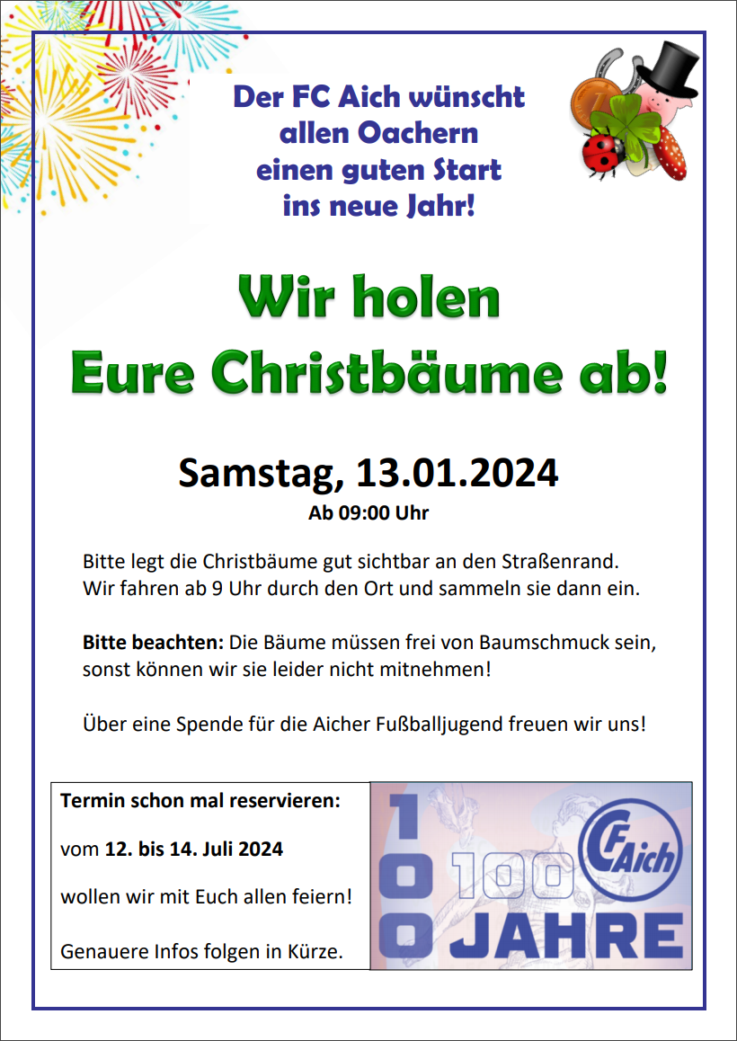Wir hoffen Ihr alle hattet eine besinnliche Weihnachtszeit mit eurer Familie und seid auch gut in das neue Jahr gerutscht. Doch nun wird es langsam Zeit den Weihnachtsbaum abzubauen und sich voller Tatendrang in unser Jubiläumsjahr zu stürzen. Deshalb bieten wir auch dieses Jahr wieder für alle Bewohner in Aich die Abholung der alten Christbäume an. Stellt die abgeschmückten Bäume am Samstag, den 13.01.24 vor eure Haustür und wir sammeln sie ein.