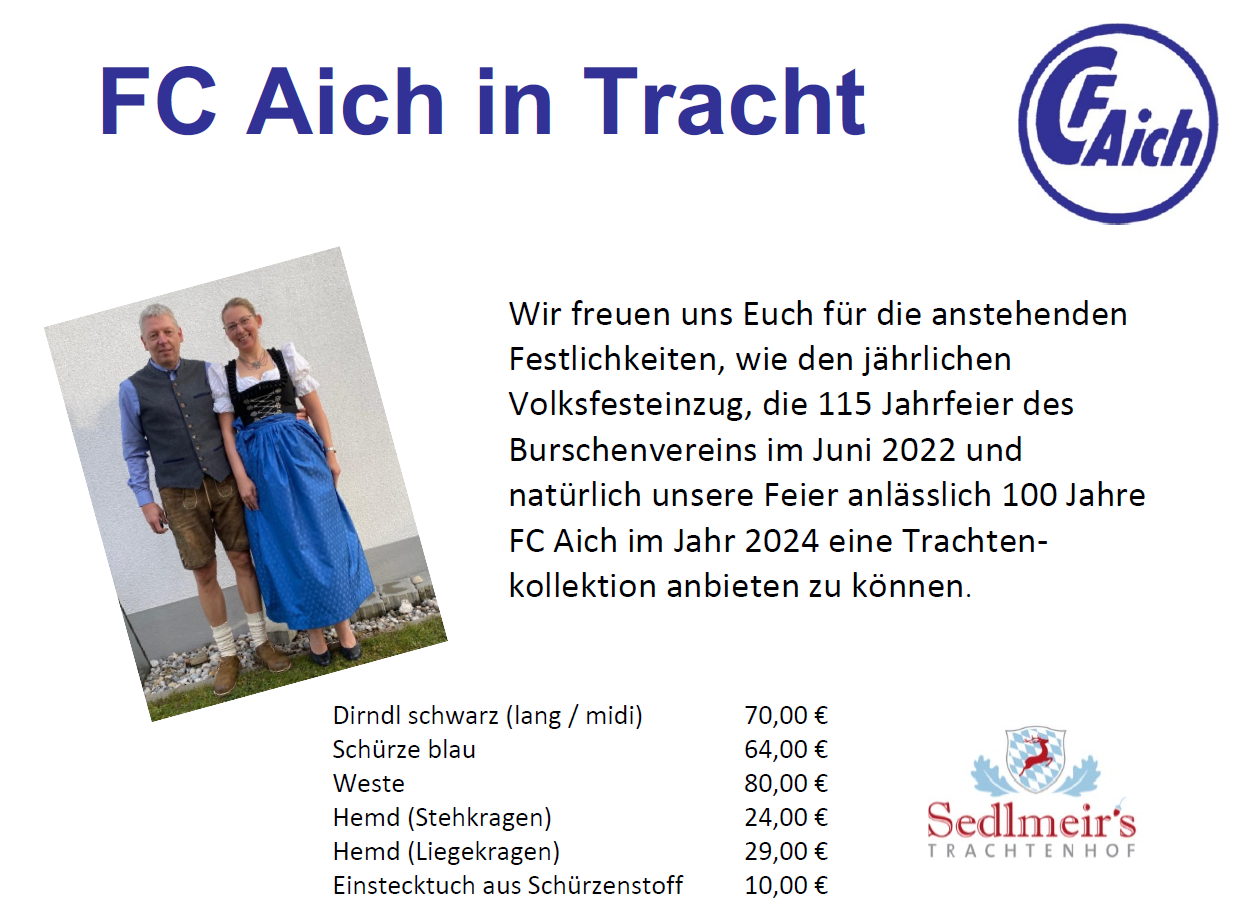 In Zusammenarbeit mit Sedlmeir’s Trachtenhof können wir Euch eine FC Aich Trachtenkollektion anbieten. Mehr Details dazu auf unserem Flyer.