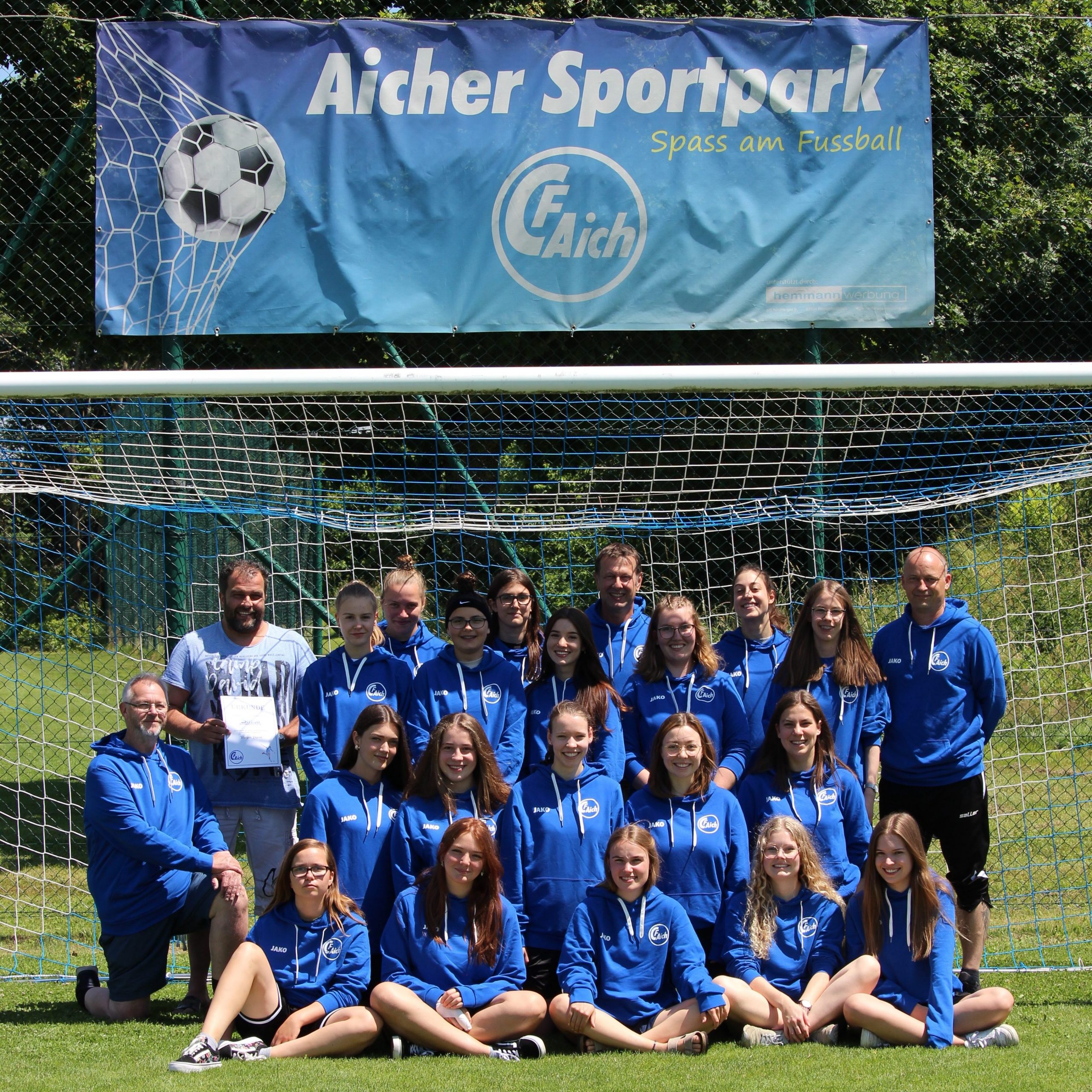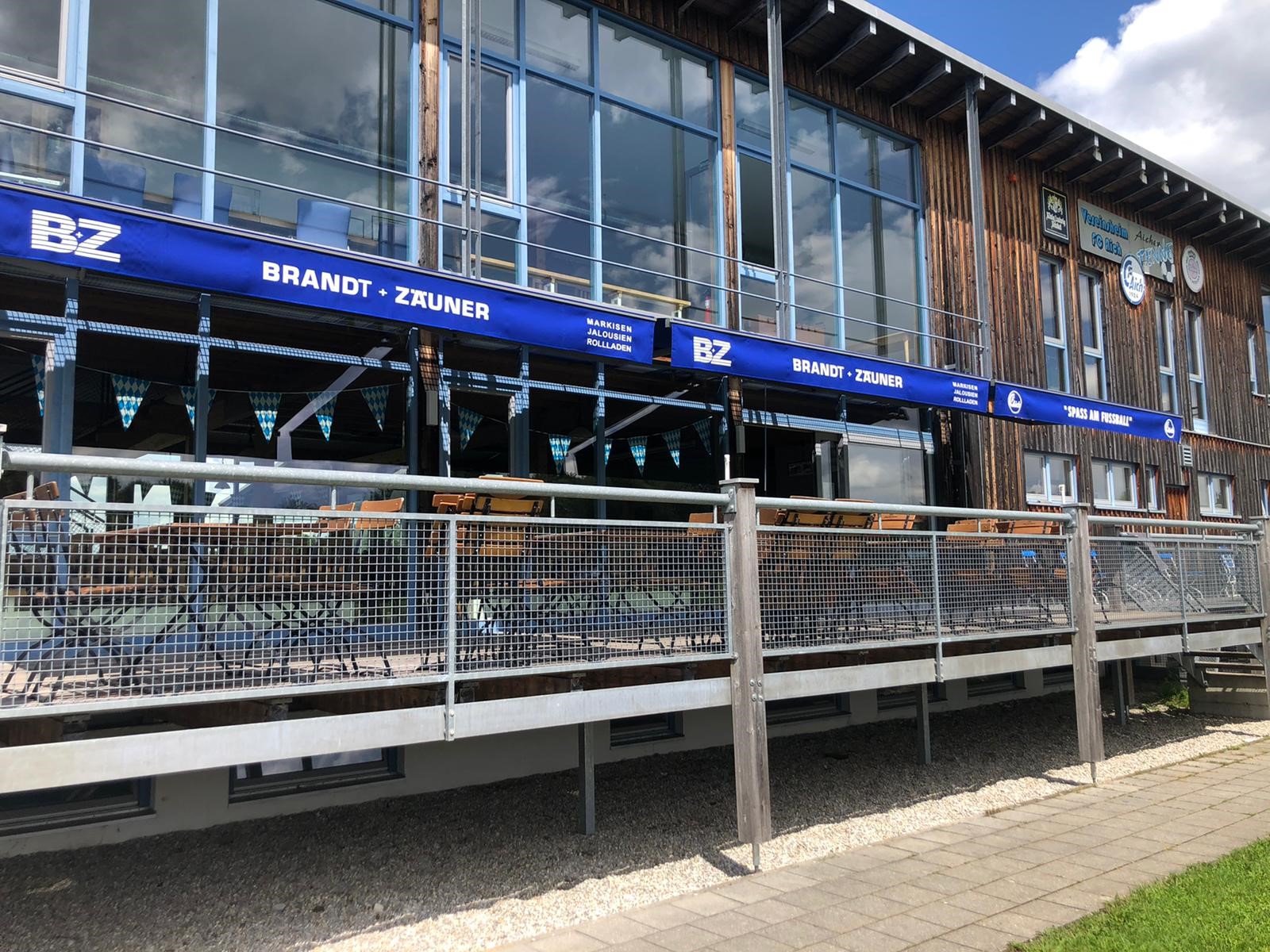 Die lange fußballfreie Zeit hat der FC Aich dafür genutzt, um mal so richtig aufzuräumen. Es wurde repariert, geputzt, erneuert, gestrichen und poliert. Alles erstrahlt im neuen Glanz… bis auf die Terrasse! Trotz Sonnenschein hingen die Markisen blass, fransig und traurig runter. Dank der Großzügigkeit der Firma Brandt & Zäuner konnten neue Markisen in Vereinsfarben angebracht werden. Nun steht einer guten Saison nichts mehr imWege. Die Zuschauer können jetzt gut beschattet ein kühles Getränk oder ein Eis genießen, während Sie spannende Spiele verfolgen und bejubeln.