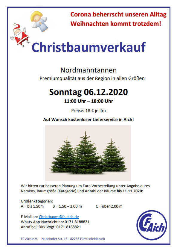 Wir möchten Euch heuer zum ersten Mal die Möglichkeit bieten einen Christbaum beim FC Aich zu kaufen. Kommt am 6. Dezember zwischen 11 und 18 Uhr aufs Vereinsgelände, nehmt Euch einen Baum mit oder lasst ihn Euch auf Wunsch innerhalb von Aich sogar liefern.