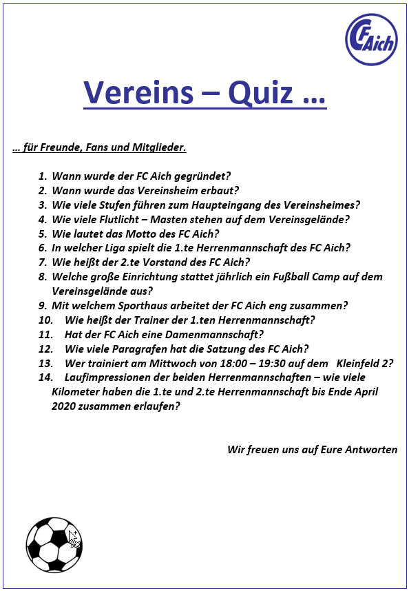 Damit die Zeit bis zum ersten Einsatz auf dem Vereinsgelände nicht allzu lang ausfällt, freuen wir uns, Euch unser FC Aich Vereins Quiz präsentieren zu können. Hier könnt Ihr Euer Wissen rund um den FC Aich unter Beweis stellen.