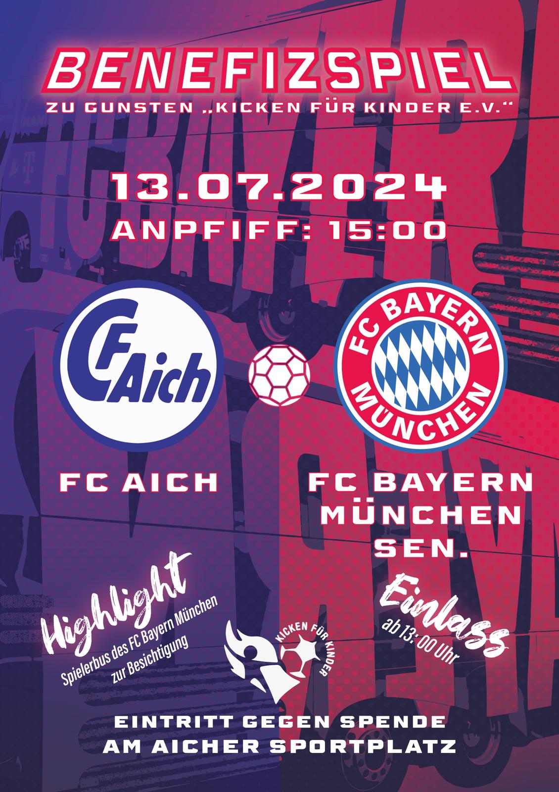Am Samstag, dem 13.07. um 15:00 Uhr wird es ein Benefizspiel gegen die FC Bayern Senioren zu Gunsten des Vereins “Kicken für Kinder e.V.” geben.