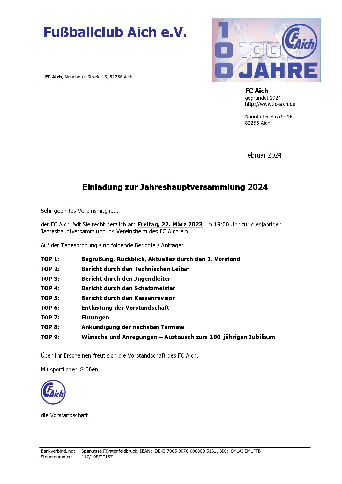 Dieses Jahr laden wir alle stimmberechtigten Mitglieder des FC Aich am 22. März um 19 Uhr zur Jahreshauptversammlung in unser Vereinsheim ein.