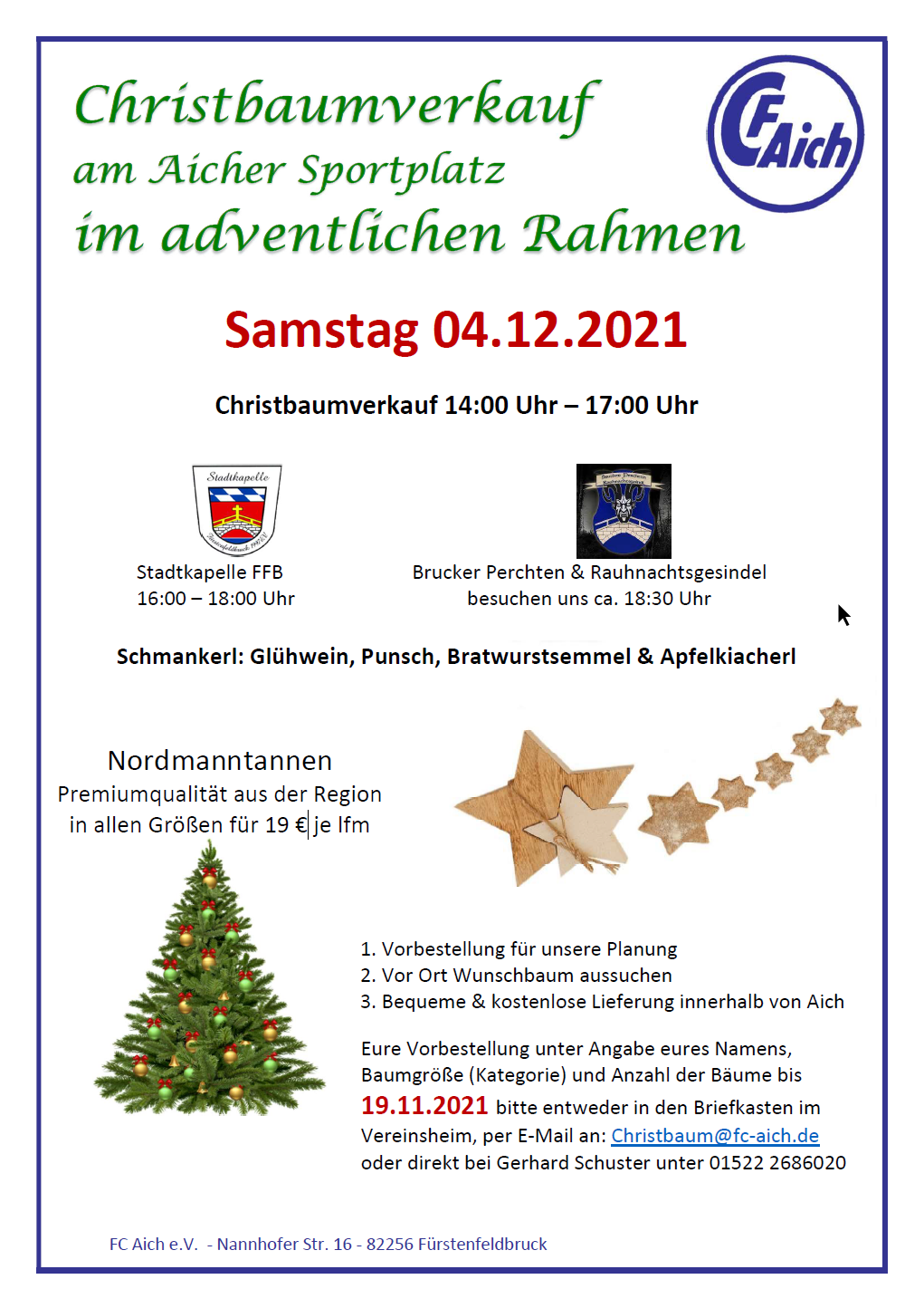 Noch bis zum 19.11. könnt Ihr einen Baum vorbestellen. Meldet Euch dazu entweder per Mail unter Christbaum@fc-aich.de oder wendet Euch direkt an Gerhardt (01522/2686020).